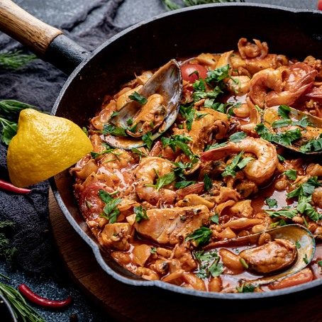 Состав: Судак, мясо мидий, креветки тигровые, томаты в собственном соку, лук репчатый, масло подсолнечное, морковь, сахар, чеснок, тимьян, соль