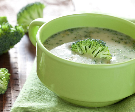 Нежный суп-пюре из молодого кабачка и брокколи. Бархатистая структура, свежий вкус.