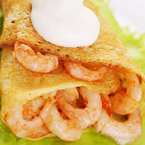 Нежный расплавленный сыр, румяный бекон, запечённая тигровая креветка в румяном блинчике.