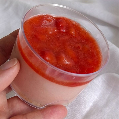 Состав: Кокосовое молоко, клубника, вода, сироп топинамбура, аквафаба (отвар бобовых), масло кокосовое, мука кокосовая, мука миндальная, эритрит, цедра, пектин, камедь ксантановая.